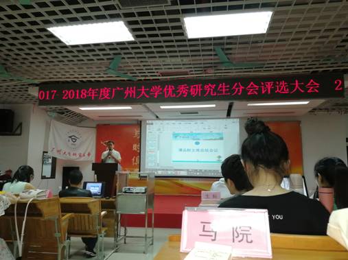研究生陈蒙蒙就本院研分会举办过的活动及对外交流项目进行了PPT汇报,赢得了老师及其他学院研究生分会同学的一致好评,并获得“优秀研究生分会”现场投票第二名的成绩。