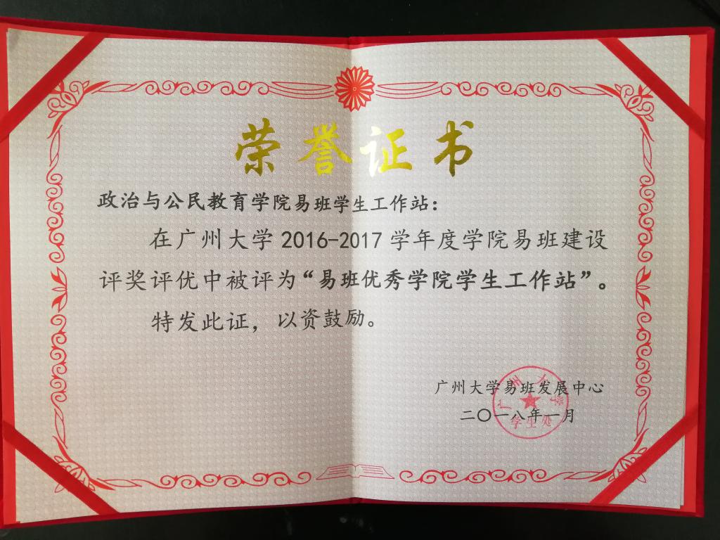 2016-2017学年度“易班优秀学院学生工作站”荣誉称号。成为学校十个首批获评年度“易班优秀学院学生工作站”之一。辅导员姚倩婷老师荣获“优秀易班指导老师”称号。