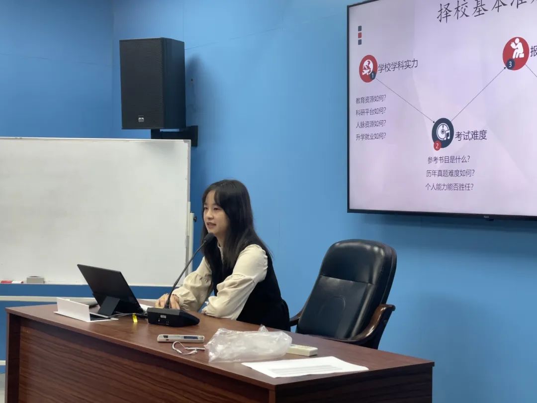 最后,成功考入“985工程”建设高校华南理工大学的张洁莹同学在线下会场进行经验分享。她分析了择校技巧,并对公共课的备考提供了详细的建议。同时,她还向同学们分享了自己的读研初体验,以此来鼓励同学们坚持更进一步考取研究生的理想信念。她告诫同学们不仅要科学制定考研计划,而且要持之以恒予以执行,不焦虑不放弃,最终取得理想的成绩。
