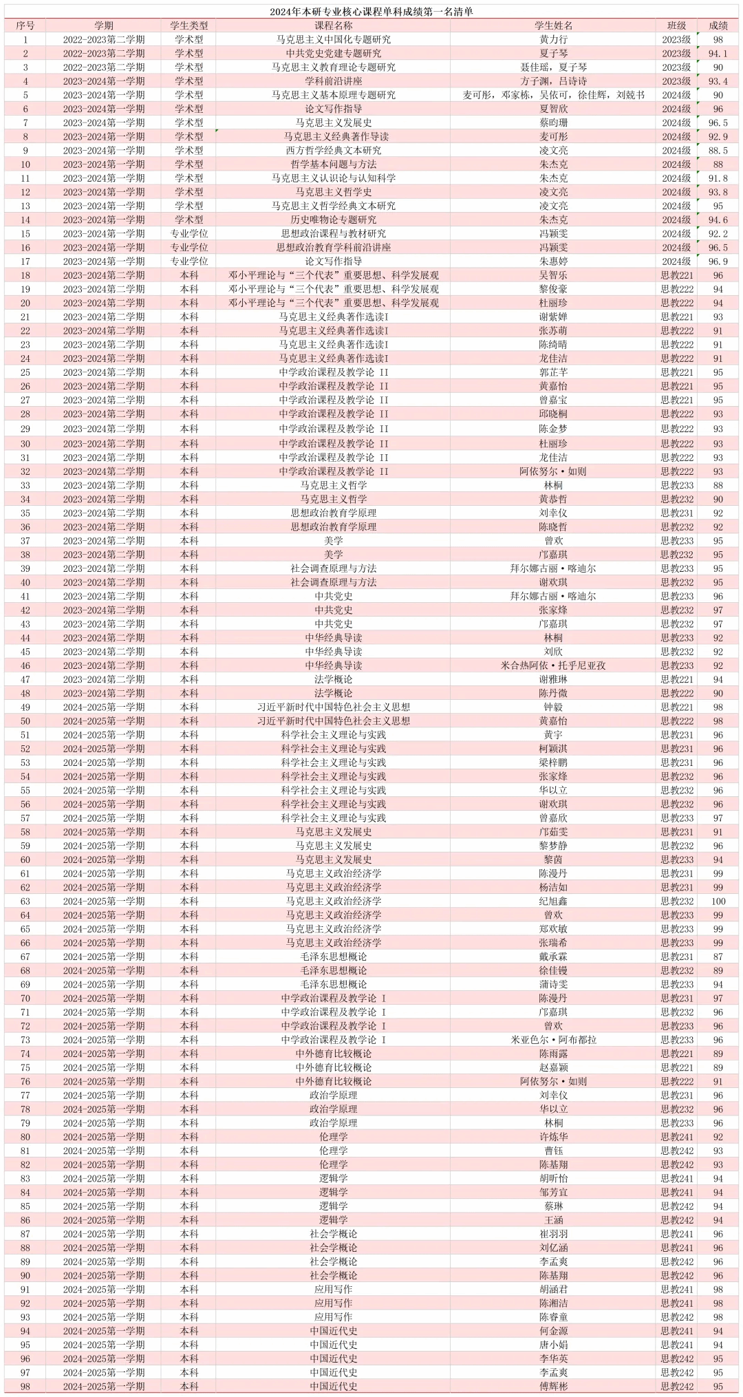 2.学业成绩突出学生。根据2024年春季学期、秋季学期本研非毕业班学生期末考试成绩,在本科生中,选取各班专业核心课程单科成绩第一名的学生。在研究生中,选取各班专业必修课单科成绩第一名的学生。