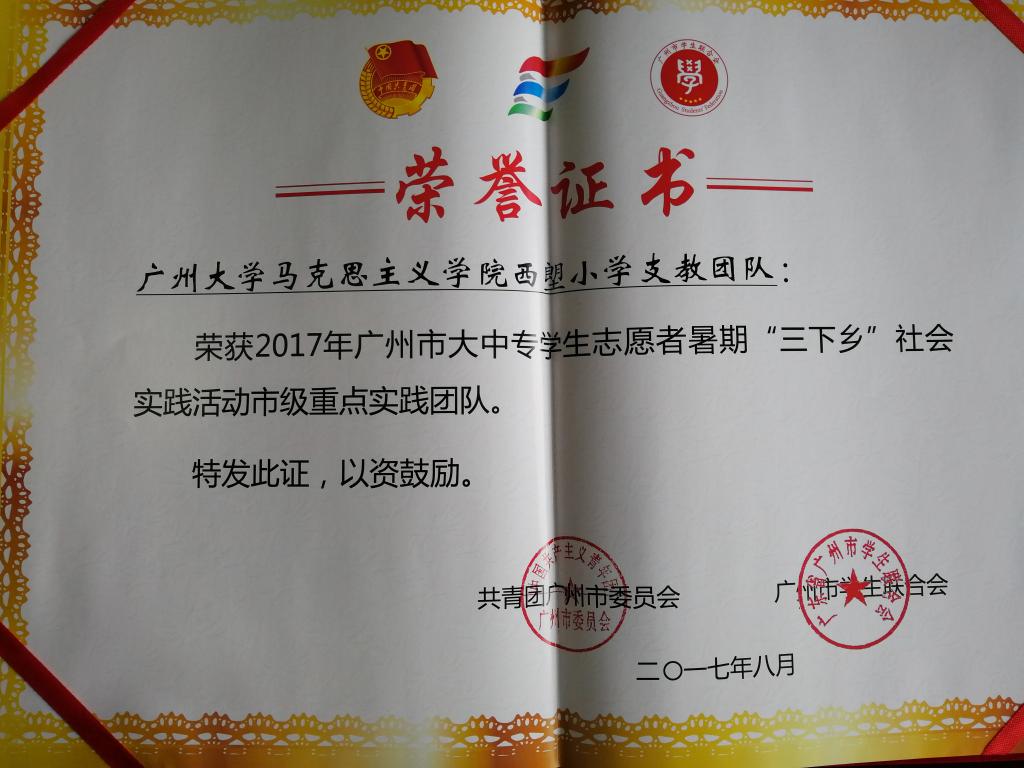 2017暑期“三下乡”社会实践“标兵服务队”称号。