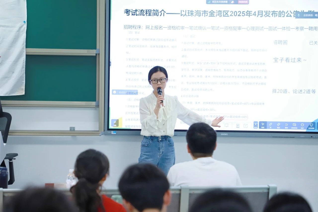 蔡炫钰面对台下同学们时,将自己在教师编笔试和面试备考中的经验分享娓娓道来。她以面试中的试讲为例,鼓励我们保持大胆自信的底色,用热情投入的态度感染评委。在面对同学们对于选择考编还是考研的疑问,蔡炫钰给出了她的答案:“要提前做好准备,考编和考研两手抓。”