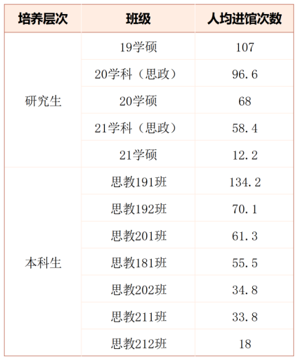 2021年度厕所偷拍 人均进馆63.5人次。其中本科生57.6,研究生82.1。