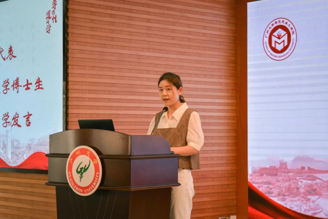 华南理工大学2022级在读博士陈金莲同学结合本硕在广大求学的经历向新生们分享了大学学习与生活的经验,“你可以在角落里发霉,更可以在角落里发光”,激励大家专注学习、热爱生活,提出了要博览群书、关注时事、与时俱进的宝贵建议。