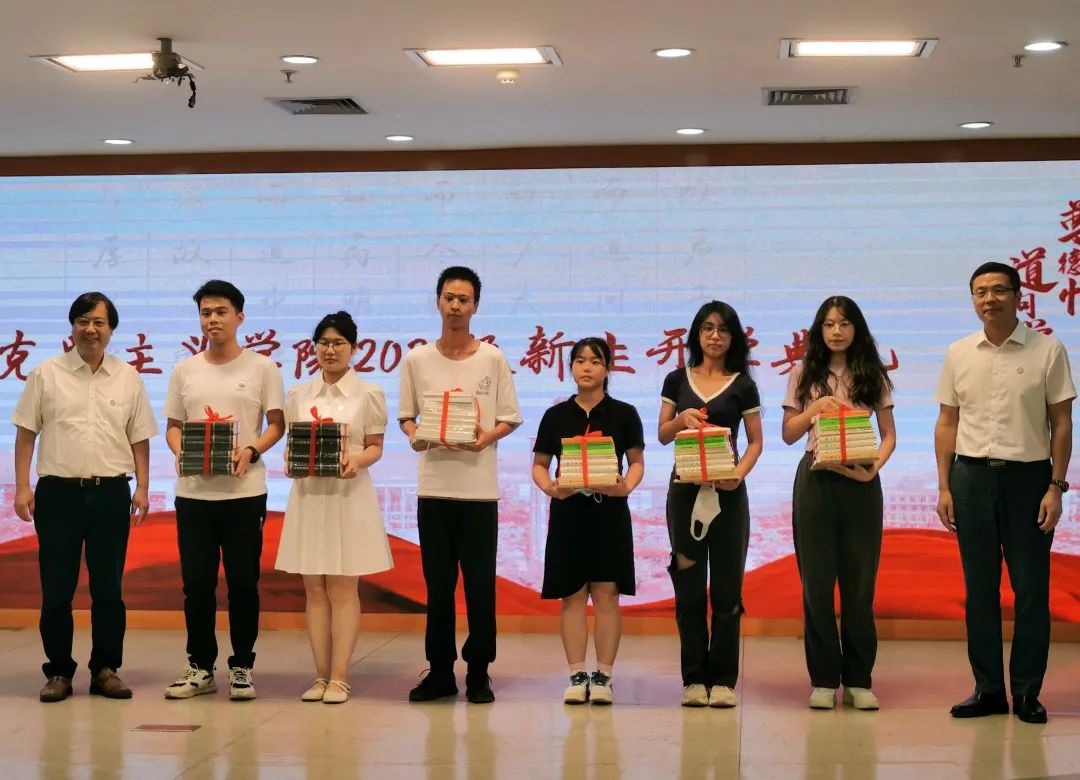 在赠书仪式环节,赵中源院长、罗明星书记为本研新生代表赠书。作为马院的一项传统,这些专业书籍也将发给每一位新同学。学院殷切期望新生们能够沉醉于阅读经典,走入崇高的知识殿堂,于真理中汲取力量