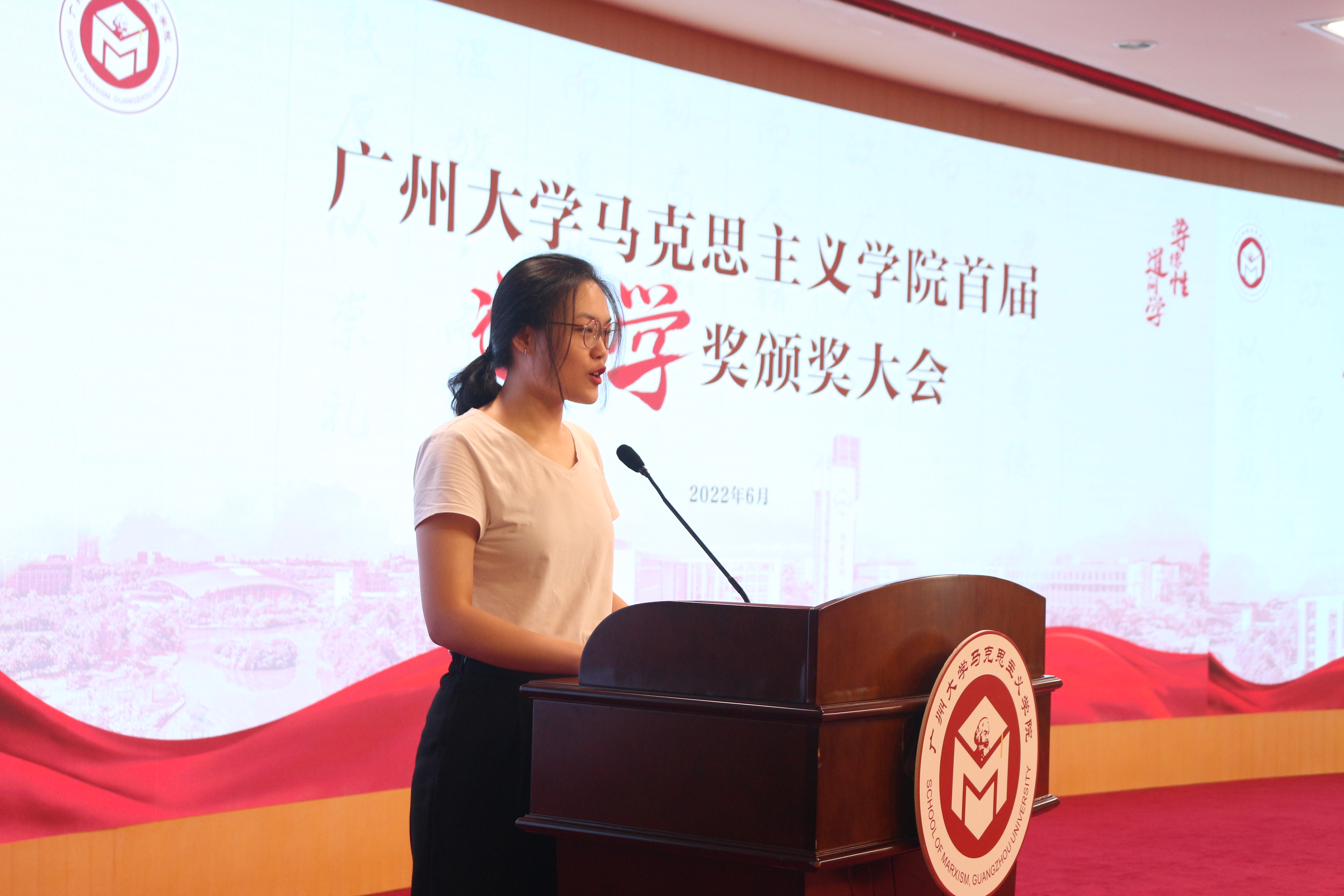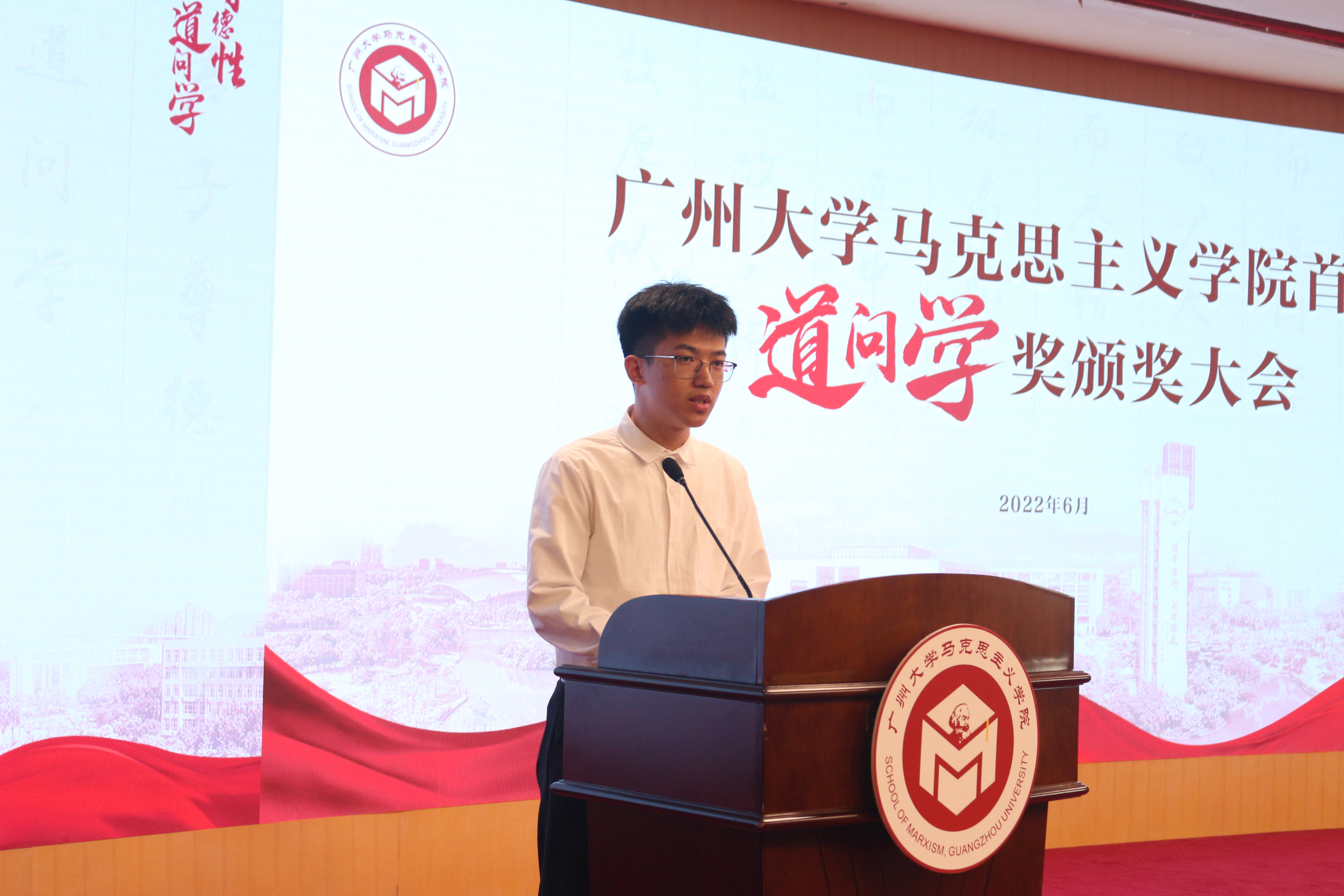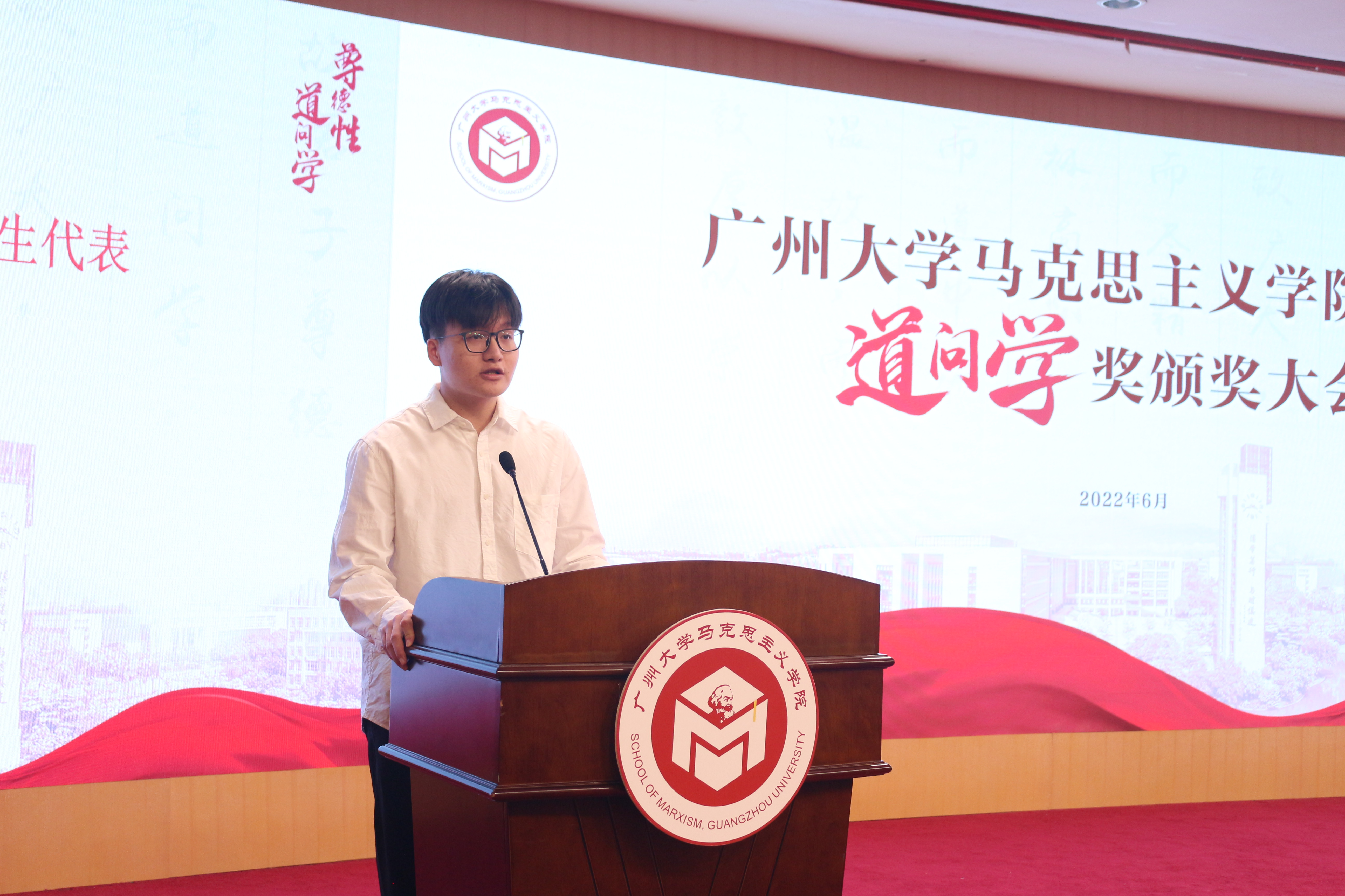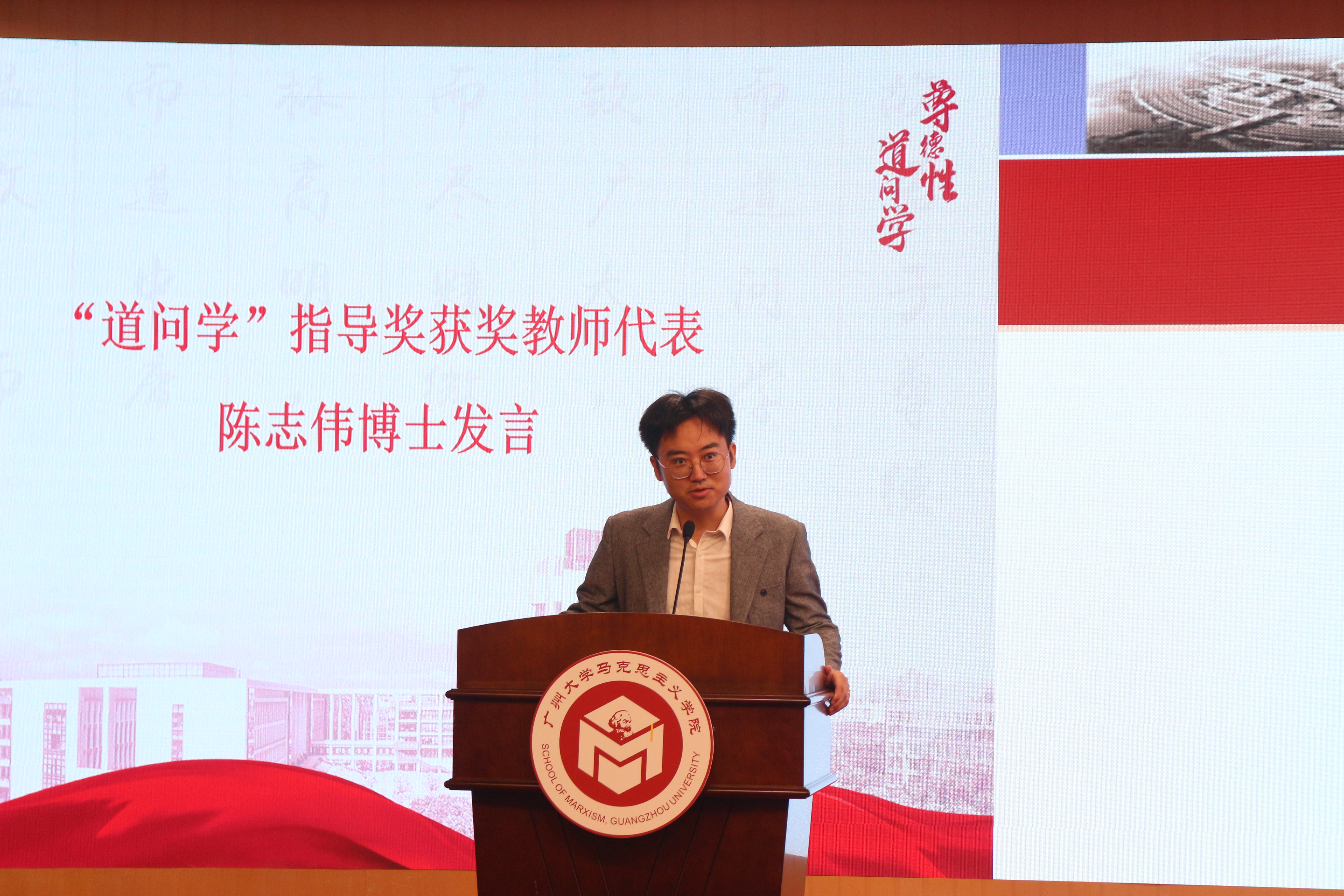 陈志伟博士作为获奖教师代表发言。他表示,“道—问—学”是做学问的基本态度。“道”是最高的存在与源头,规定着“问”与“学”以及做学问的基本态度“求真”。他以五项要求勉励马院学子追求卓越:学习的范式要由他学转向自学,学习的范围要广,读书要读经典,同一个问题要从多个角度解释,学习的要义在于习得“忘记”之后的思维方式。