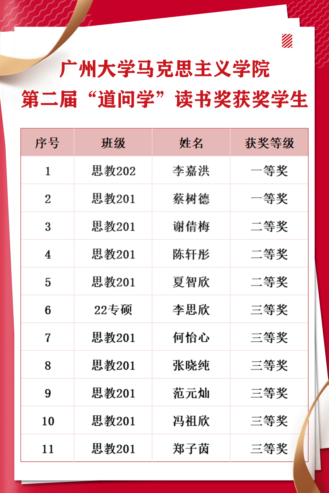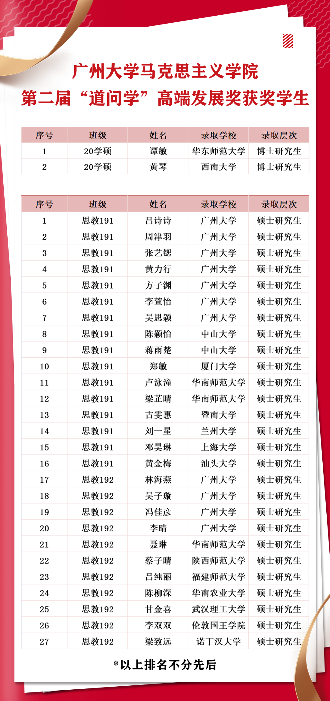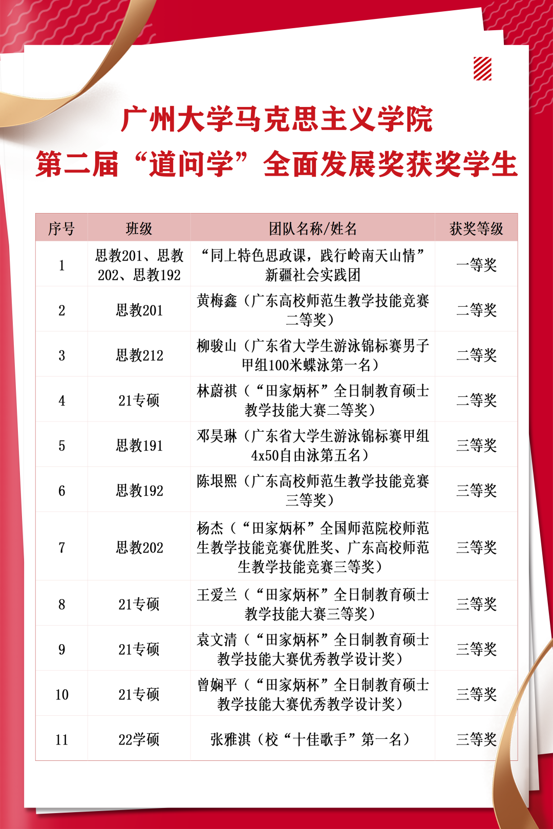 第二届“道问学”全面发展奖获奖名单。