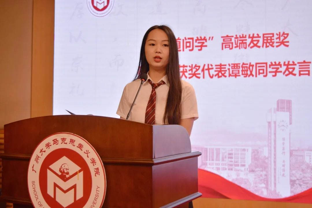 “道问学”高端发展奖研究生获奖代表谭敏同学、“道问学”高端发展奖本科生获奖代表郑敏同学、“道问学”全面发展奖获奖学生代表木合塔尔·艾尼同学以及“道问学”读书奖获奖学生代表李嘉洪同学依次进行发言,他们分别表达了自己对学院及老师们的感恩之情,同时分享了自己的考研经历、赴疆实践体会和读书经验等。