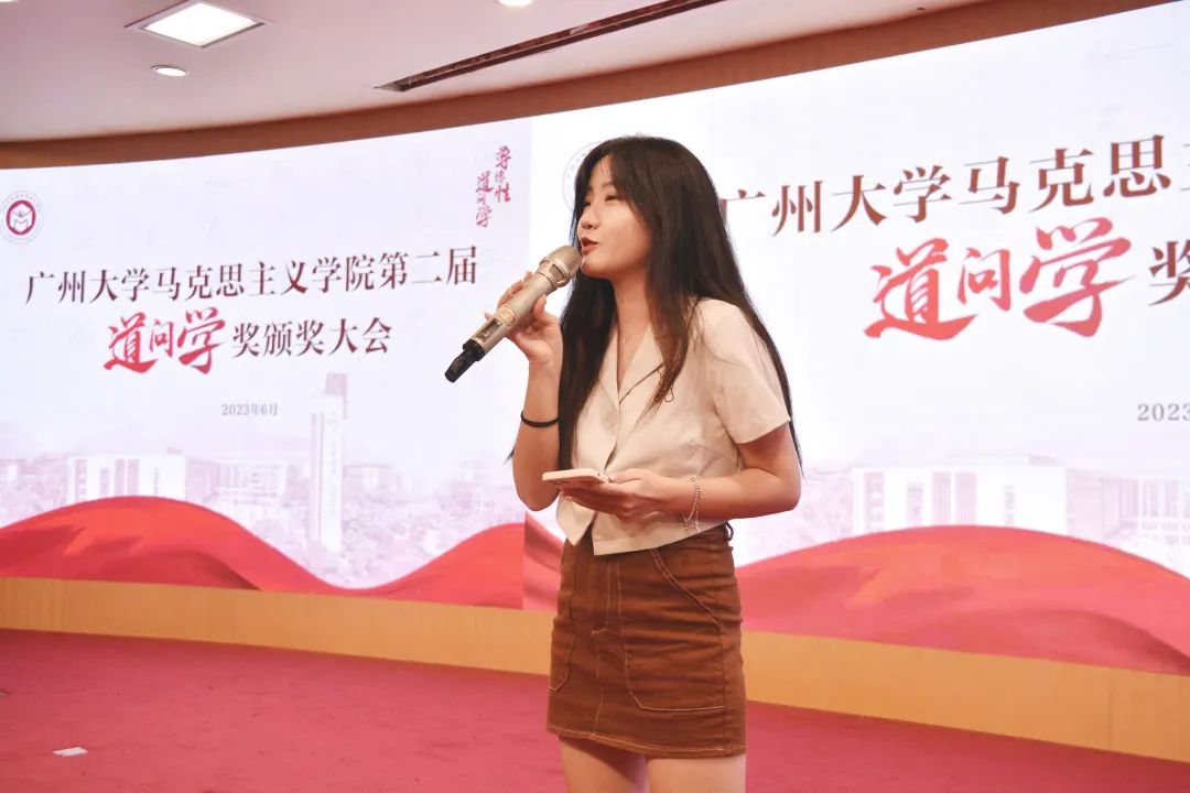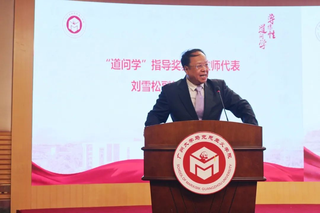 “道问学”指导奖获奖教师代表吴阳松教授发言。吴阳松首先对获奖同学表示衷心的祝贺。他表示,“道问学”奖项的颁发是对同学们在大学阶段的检验,证明了同学们在马院学有所获、学有所成。他提出,老师和学生如同一对辩证关系,同学们感谢老师的辛勤培育,老师也感谢同学们成就了自身的职业价值。他希望仍在求学路上拼搏的同学继续刻苦钻研,也寄语即将踏入工作岗位的毕业生们接续奋斗,实现人生价值。