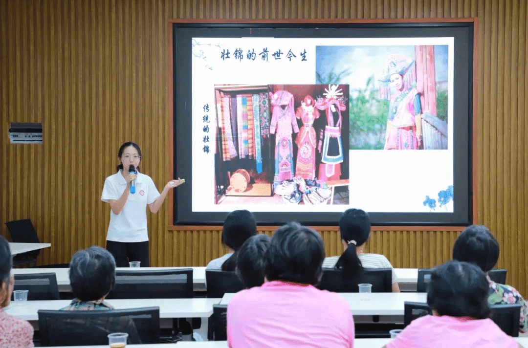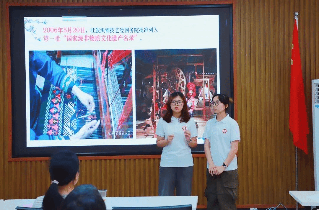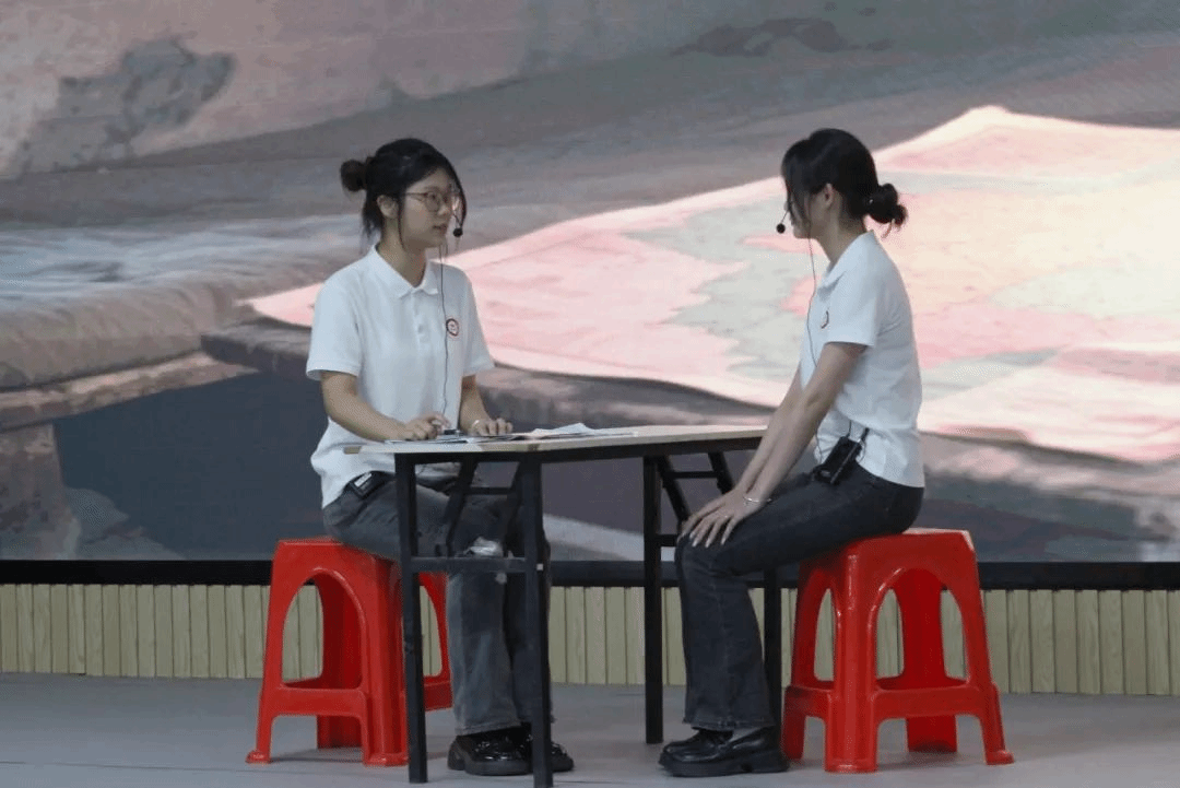 王炘怡、邱晓桐、程裕如、王凯玲、蔡贵钰5人聚焦“领悟新时代清远非遗魅力”,展示了清远非物质文化遗产——壮锦。她们以讲述穿插情景剧的形式,生动展现了在融入现代审美的创意设计,又借助网络直播拓展市场后,壮锦焕发出新的时代光彩。