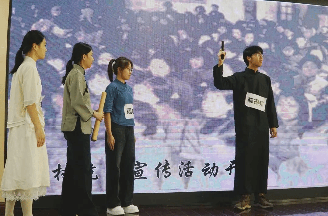 张家烽、刘亿涵、李思凡、蔡桂林、何嘉豪、唐小娟、傅辉彬7位同学演绎的情景剧“冼星海:信仰为谱,家国共振”,生动再现了人民音乐家冼星海在民族危亡之际,舍弃优厚待遇,矢志奔赴革命圣地延安,以音乐为武器投身抗战洪流、创作《黄河大合唱》的心路历程,深刻诠释了人民音乐家冼星海炽热的家国情怀及其所迸发出的磅礴精神力量。