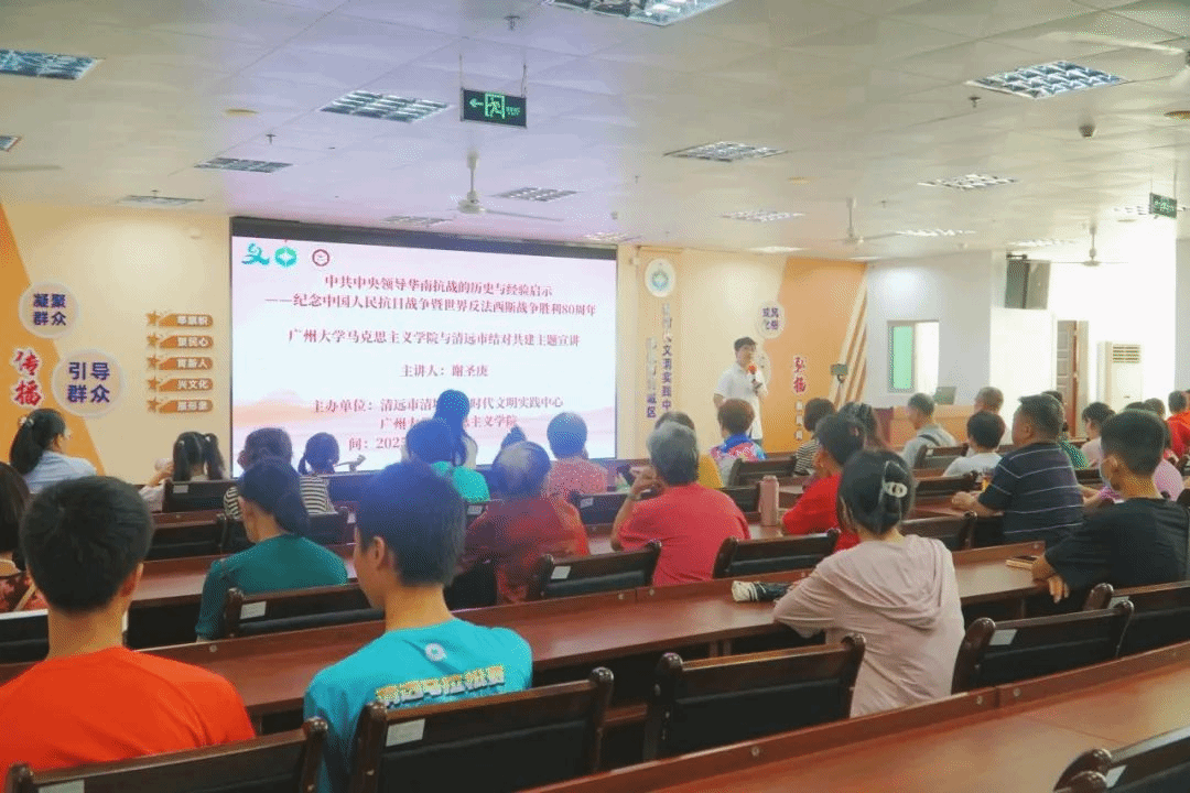 谢圣庚博士以“中共中央领导华南抗战的历史与经验启示”为题进行宣讲。他阐述了中共中央在华南抗战中的体制机制、战略布局、历史进程及经验启示,并将宏大的历史叙事与具体的战斗故事相结合,具体讲述了清远的抗战历史。他强调,在中共中央领导下,中共广东党组织高举抗日民族统一战线旗帜,领导抗日救亡运动,成为华南抗战的中流砥柱。谢圣庚精彩的讲述让听众深刻感受那段烽火岁月的艰辛与伟大,引发当地基层群众的热烈反响。