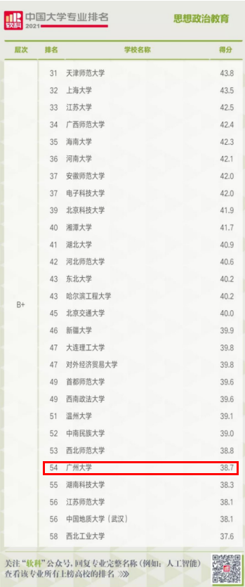 2021年6月22日,高等教育评价专业机构“软科”正式发布2021“软科中国大学专业排名”。排名包括509个本科专业,发布所有开设该专业的高校中排名位列前50%的高校。共有925所高校的28550个专业上榜。思想政治教育专业排名中,共有146所高校上榜,厕所偷拍