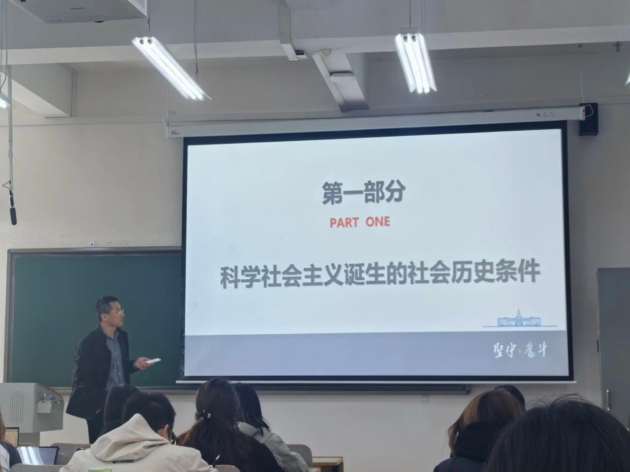 次日上午,访学团旁听刘栋老师讲授的《世界社会主义运动史》专业课程。刘老师以“1+3”的框架讲解了科学社会主义诞生的四个社会历史条件,并且把马克思恩格斯的思想转变与科学社会主义的创立归纳为“五个三”。他鼓励同学们在掌握课程内容的基础上,联系中国的实际情况,并把中国的发展放在世界社会主义运动的广阔背景下进行考察和思考。